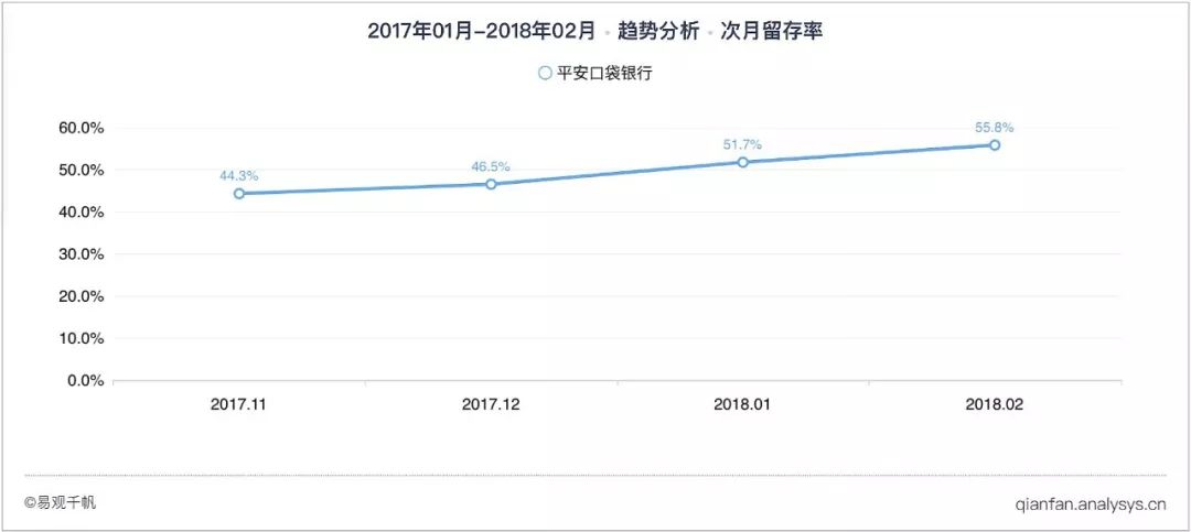 在用户启动次数及使用时长上,平安口袋银行在去年一年来,都呈现出阶梯式上升,2018年1月启动次数14949.1万次,同比增幅567.7%;使用时长720.3万小时,同比增幅625.4%。在用户留存方面,平安口袋银行的数据也表现堪佳,次月留存率从2017年11月的44.3%增长为2018年2月份的55.8%,在银行应用中保持较高水平。