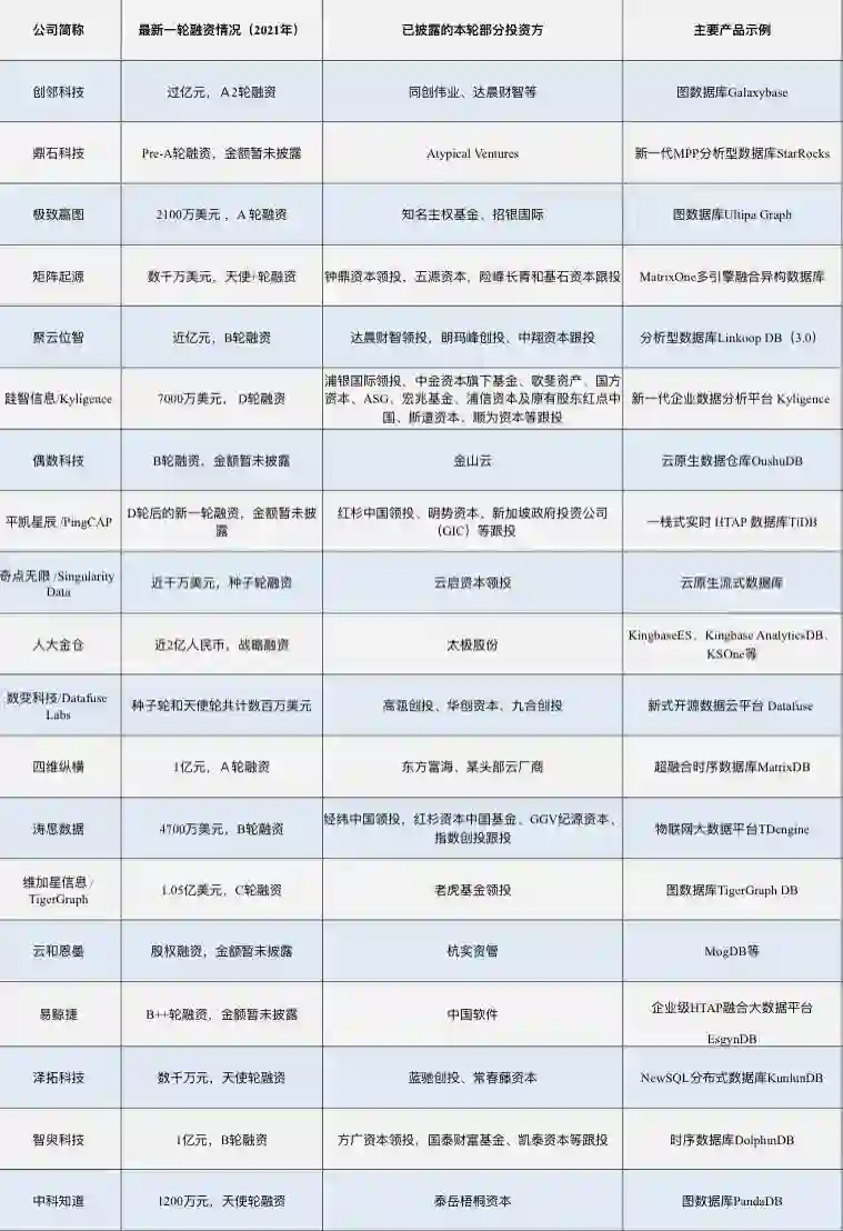2021年部分数据库融资统计(来源:36氪、天眼查,排名不分先后)