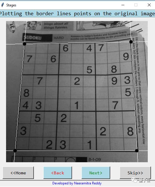 之后找出边缘的四条线,通过这四条线,将拍到的数独题目变成一张正方形图片。