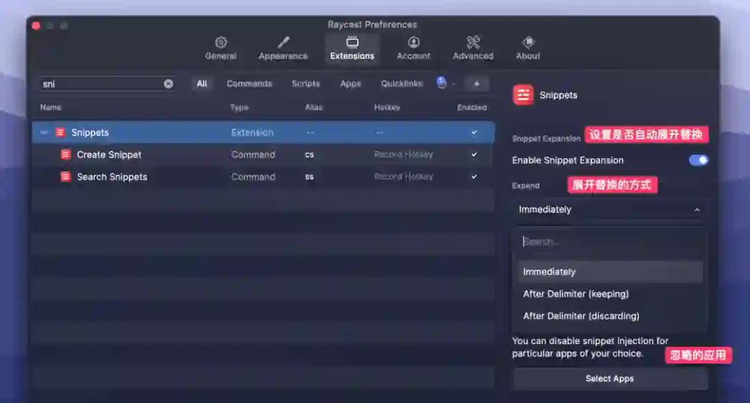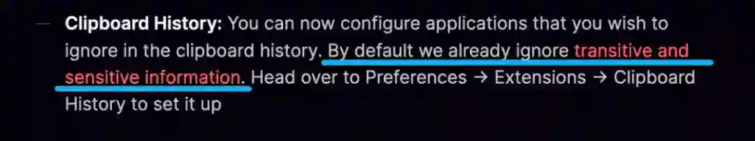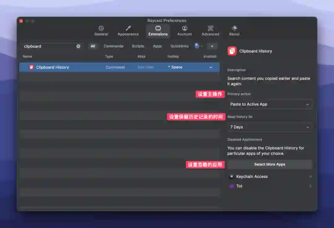 设置忽略的 app(比如不保存从密码管理器复制的内容;Raycast 默认会自动忽略一些敏感内容)