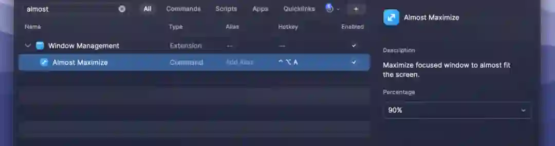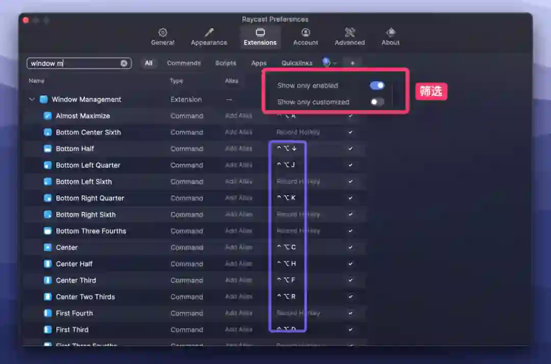Tip: 如果觉得太多了,你不需要用到所有的指令,可以在右上角筛选「仅展示启用的」或「仅展示自定义过的」指令。