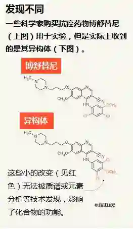在一个臭名昭著的案例中,近20家供应商提供一种已获批的抗癌药物博舒替尼,却被发现实际出售的是一种化学基团错乱的相关结构(参见下图“发现不同”和网页go.nature.com/2w3dz0a)。博舒替尼和另外那一种结构都结合了一组细胞信号传导蛋白,但其功效不同,这种混淆可能会使数十篇论文遭到质疑。