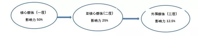 还有一个基础性问题需要解决,即把一个人所认识的群体根据偏好、亲疏远近做划分是否有道理呢?哈佛大学的社会学教授尼古拉斯·克里斯塔基斯提出的“三度影响力”原则可以支持我们对群体结构的划分。按照尼古拉斯的说法:我们所做或所说的任何事情,都会在网络上泛起涟漪,影响我们的朋友(一度)、我们朋友的朋友(二度),甚至我们朋友的朋友的朋友(三度)。如果超出三度分隔,我们的影响就逐渐消失。尼古拉斯的“三度”分别对应我们的核心群体、亚核心群体与外围群体。但是对于网络传递过程中的影响力衰减模式,尼古拉斯并没有给出具体的说明。联系到前期的一些观察,我们给出影响力逐级衰减的比例是减半规则。为了形象地说明这个问题,下面给出个体在群体中影响力衰减的示意图: