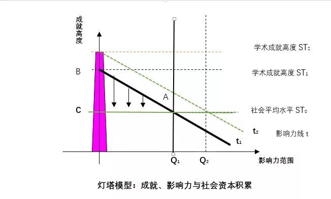 灯塔模型图中符号的意义分别是:ABC 的面积就是一个人所积攒的社会资本总量,t 线就是影响力线,当个人能力提升的时候,影响力线从 t1 向 t2 上移,覆盖的面积增大,意味着积攒的社会资本也越多。这张图很好地揭示了提升个人成就对于影响力提升和社会资本积累的重要意义。另外,区域的社会平均水平线 ST0 也会影响个体积攒社会资本难易程度。在水平高的地方混出名堂不容易,原因就在于社会平均水平较高的缘故。