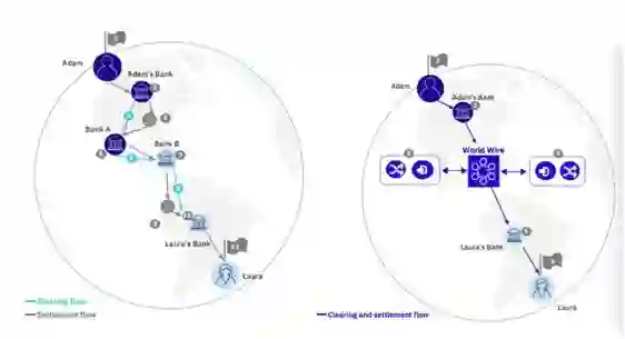 图|左面是传统美元跨境支付,右面数字美元跨境支付不经过 SWIFT(来源:IBM World Wire)