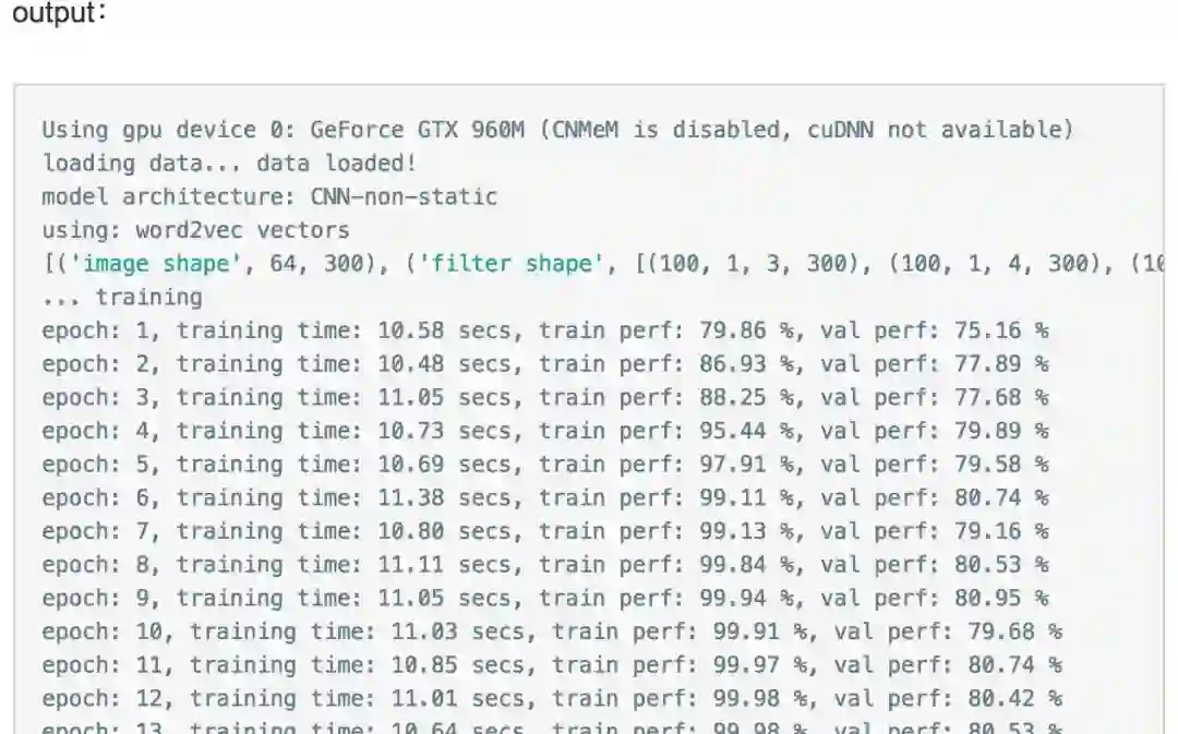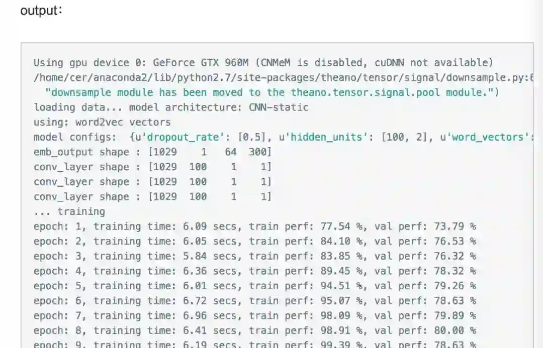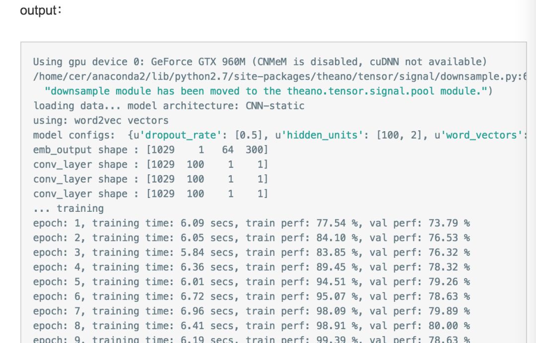 THEANO_FLAGS=mode=FAST_RUN,device=gpu,floatX=float32 python conv_net_sentence.py -nonstatic -word2vec