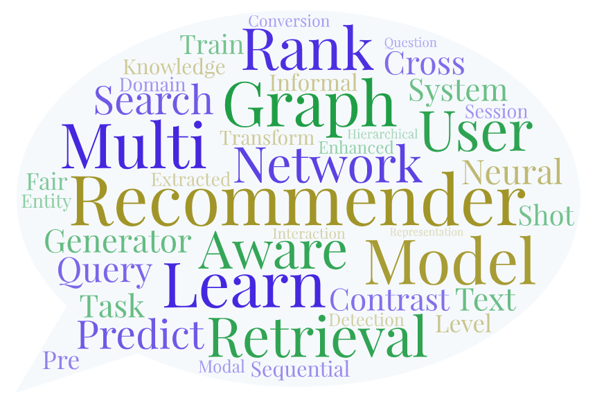 从词云图看今年SIGIR的研究热点:根据长文和短文的标题绘制如下词云图,可以看到今年研究方向依旧集中在Recommendation,也包括Retrieval、Query等方向;主要任务包括:Ranking、Cross-domain、Multi-Model/Behavior、Few-Shot、User modeling、Conversation等;热门技术包括:Neural Networks、Knowledge Graph、GNN、Contrastive Learning、Transformer等,其中基于Graph的方法依旧是今年的研究热点。