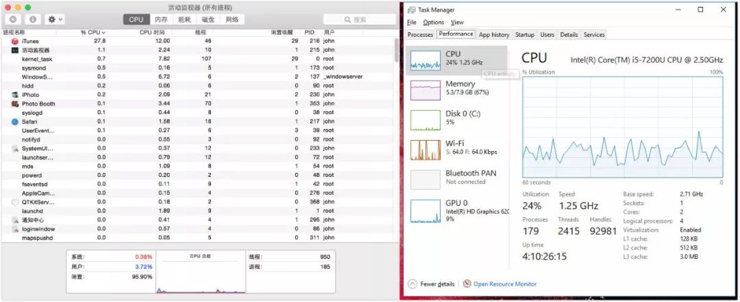 观察 CPU 占用是发现潜在挖矿劫持最容易的方法。在 PC 上打开任务管理器,点击性能;在 Mac 上打开自带的活动监视器 (Activity Tracker),就可以看到 CPU 占用情况了。