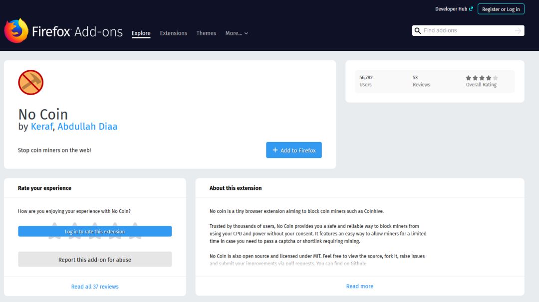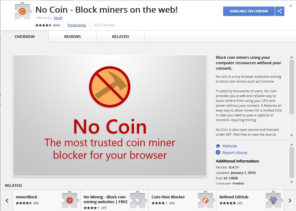 主流浏览器如 Chrome、Firefox 的插件平台上都已经有了隔离器,如 No Coin、minerBlock 等。这些插件可以屏蔽 Coinhive 等目前已知的挖矿脚本来源的域名,理论上不影响你所浏览网页的其他功能。
