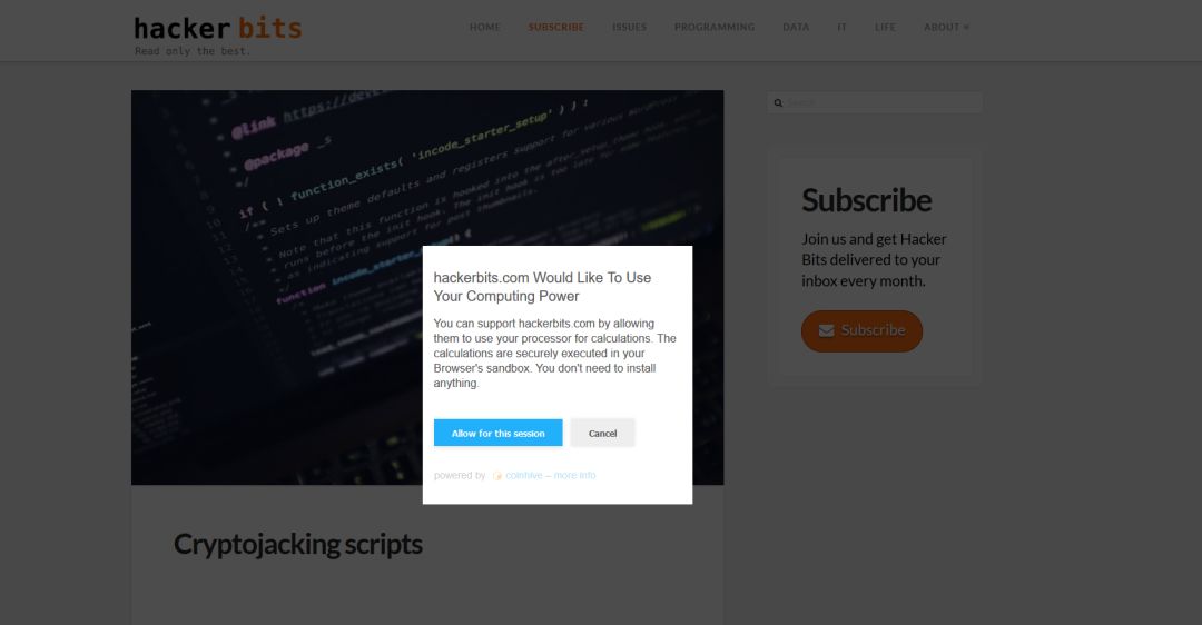 当然,也不是所有做了挖矿劫持得网站都是坏人。有些良心尚存的网站会弹出明显的提示,告诉你网站植入了代码,问你是否同意,如果不同意即不执行,如下: