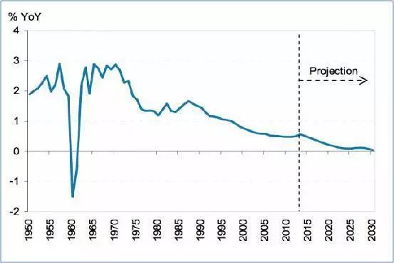 1971年,中国开始全面计划生育,特别是70年代后期,是中国人口发展出现根本性转变的时期。政府陆续制定和完善了明确的计划生育政策,人口高出生、高增长的势头被迅速控制,人口自然增长率自此一路下滑,从1971年的23.4%,一路不回头下滑到2015年的4.96%,而生育率(妇女一生生育的子女数量)也从1990年开始连续25年低于种群正常更替水平(保证种群不萎缩的生育率),人口“青黄不接”的直接后果,是劳动适龄人口的不断减少,整体人口的极度老化和急剧萎缩。