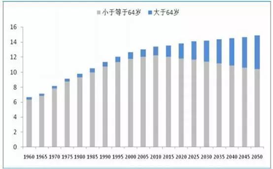 把时间轴拉长:中国65岁以上人口占总人口比重在1982年仅为4.9%,1990年为5.6%,2000年为7.1%,2010年为8.9%,2014年为10.5%,老龄化呈加速上升状态。