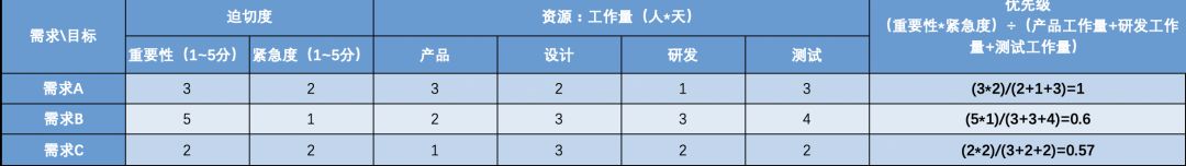 从上表优先级结果可以看到,【需求A】的优先级为1.00、【需求B】的优先级为0.60、【需求C】的优先级为0.57,所以三个需求在开发时的优先级依次为【需求A】>【需求B】>【需求C】。