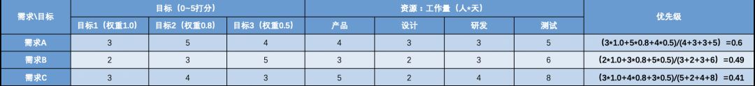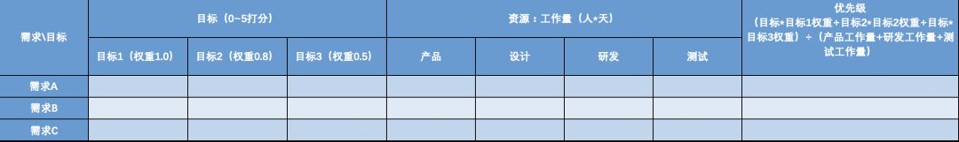 表格纵向为不同的产品需求,横向第一组的三列为需求对不同目标贡献度,第二组为为实现需求所要付出的工作量,最右侧一列为优先级得分,优先级得分的计算方式参考上述计算公式——最终得分越高,需求的优先级越高。