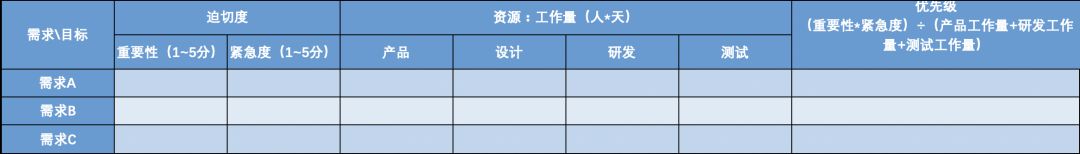 如果涉及到多个需求方,那么一定要邀请对不同需求方拥有统一管理权的更高层级的负责人参与,统一给出重要性和紧急度分数,否则不同业务必然都希望自己的需求被优先开发,很难在需求迫切度上达成一致,或所有需求的迫切度都变成最大值,迫切度因素也就失去了意义。