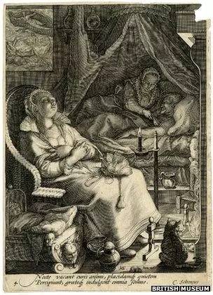 ▲ 埃克奇认为,这幅绘制于1595年的版画描绘了中世纪欧洲人民晚上分段睡的情景