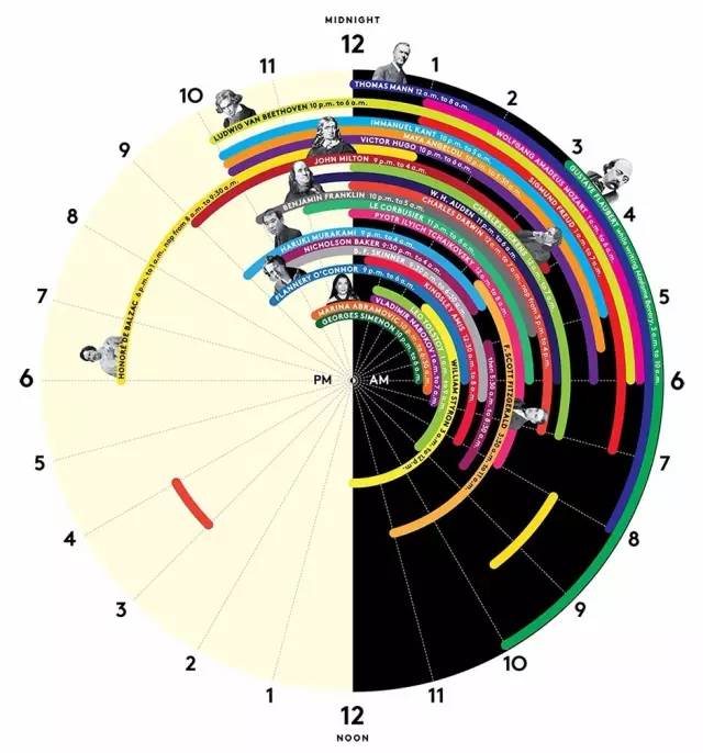 著名建筑师弗兰克·赖特(Frank Lloyd Wright)一般会在凌晨4点起来,工作3小时,再接着睡。诺贝尔文学奖获奖者克努特·汉姆生(Knut Hamsun)每天会在床头放上纸笔,睡几个小时候起来涂一会儿鸦、写一会儿字,然后接着睡。