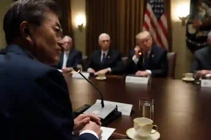 美国总统特朗普在白宫会见韩国总统文在寅,抱怨美韩贸易逆差