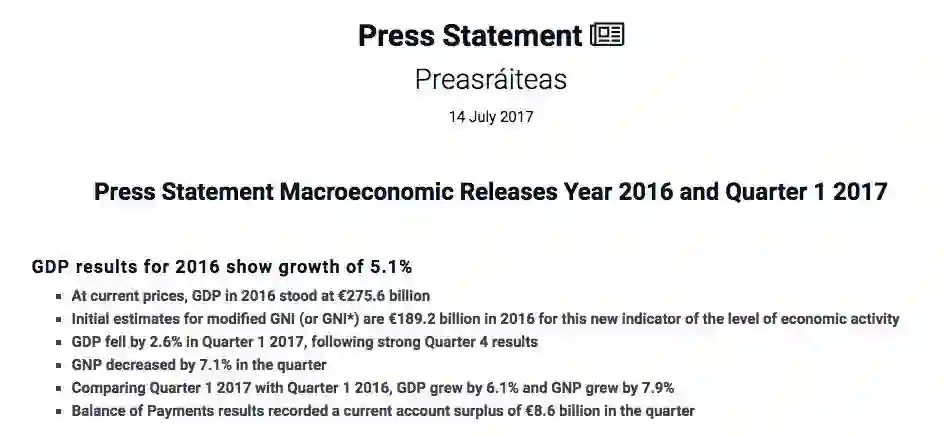 爱尔兰中央统计局公布2016年和2017年第一季度总体经济声明