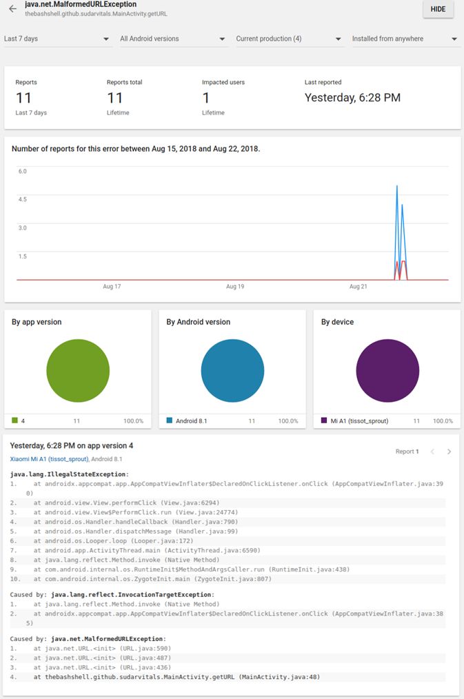 在页面底部,您可以访问崩溃日志。日志揭示了异常所属的类型,以及它在应用内的根源。这应该可以让您大概了解到一些可能的解决方案。如果发生的是很简单的崩溃现象,这可能意味着您只需把一小部分代码移入 try-catch 块,正如上图中所展示出的那样。当然,您也可能不是每次都能这么顺利地解决崩溃问题,但我们相信详尽的报告会对您颇有助益。