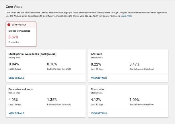 Overview 页面在顶部显示核心 vitals 指标 (崩溃、过度唤醒、ANR、部分唤醒锁定阻塞)。我们发现,这些指标对应用性能表现较为重要。 Overview 页面上提供了有关所有指标的信息,并提供了过滤功能。您可以通过单击 View Details 深入了解任意指标。