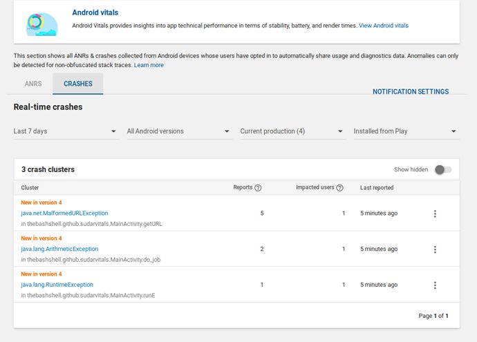 应用崩溃和 ANR 在 Android vitals 菜单下有一个专门的分区。要查看实时崩溃信息,请在 ANRs & Crashes 下选择 CRASHES。应用崩溃以群集形式显示,其中显示了报告和受影响用户的数量。您还可以根据 Android 版本、时间段、应用版本和应用安装源过滤数据。