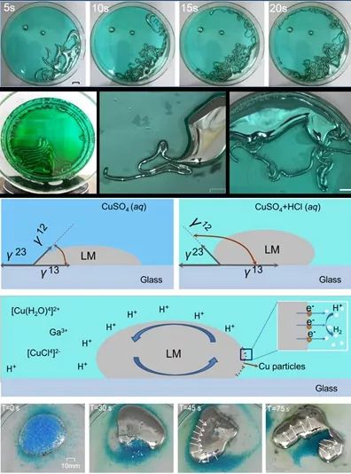 研究表明,在酸性铜盐溶液中,一团液态金属可以自发生长出大量细条状的伪足并像蛇一样运动(图2)。此现象背后的机理主要在于,因置换反应所形成的无数个微小的Cu-Ga原电池产生于液态金属和铜盐溶液界面处,这会改变液态金属的表面张力,从而产生不平衡的界面压差,最终导致了蛇形运动的发生。这里,溶液的酸性对实验结果影响巨大。在合适的酸性条件下,可通过调节酸性的强弱去控制蛇形液态金属的生成和运动速度。而且,此蛇形运动可被多次激发,大大增加了运动的持久性。研究进一步揭示,酸性铜盐溶液这一独特环境保证了无数的铜颗粒可以被持续稳定地析出和吞噬,此类动态平衡是蛇形分散运动现象得以发生的深层次原因。该现象丰富了液态金属物质世界的科学图景,进一步拓展了近年来兴起的液态金属柔性机器的理论与技术内涵。