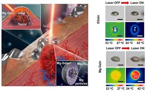 图3. 镁基液态金属皮肤涂层材料及其用于近红外激光消融治疗肿瘤原理及应用情况