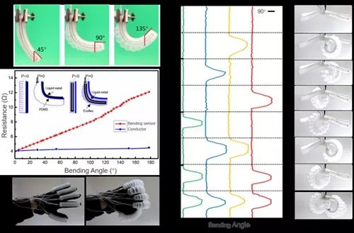 图7. 用于柔性执行器的液态金属传感器及其响应情况
