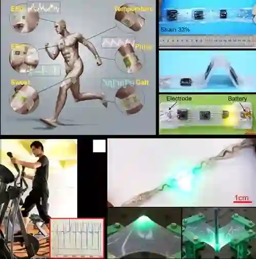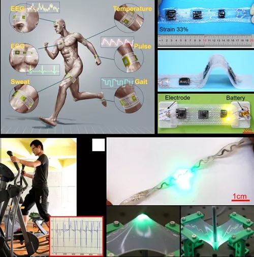 图6. 基于褶皱结构的高顺应可拉伸液态金属皮肤电子及其健康监测应用情形