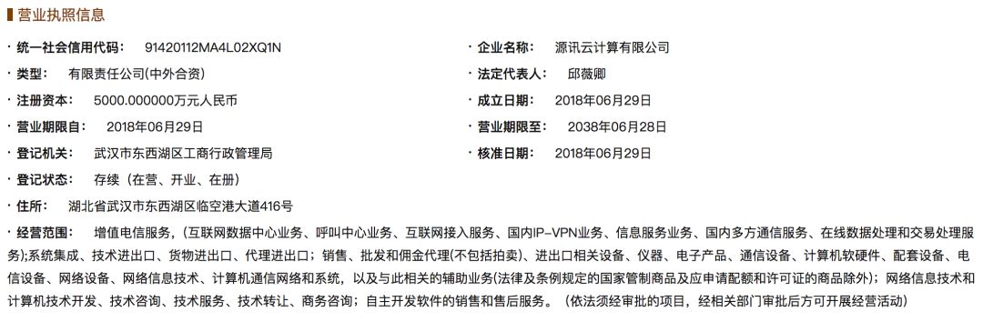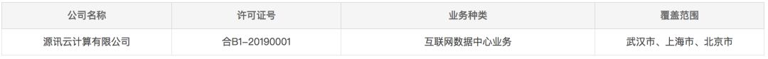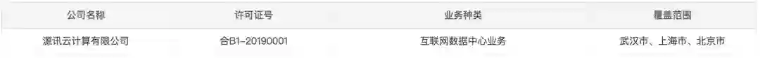 云头条通过工信部查询到,源讯云计算有限公司获得许可证号为:合B1-20190001,业务种类:互联网数据中心业务,覆盖范围:武汉市、上海市、北京市的牌照。