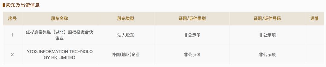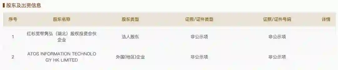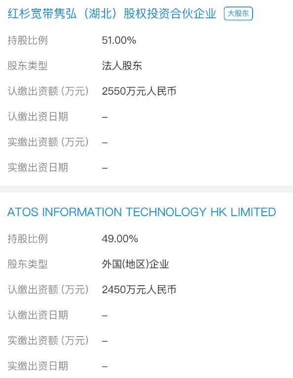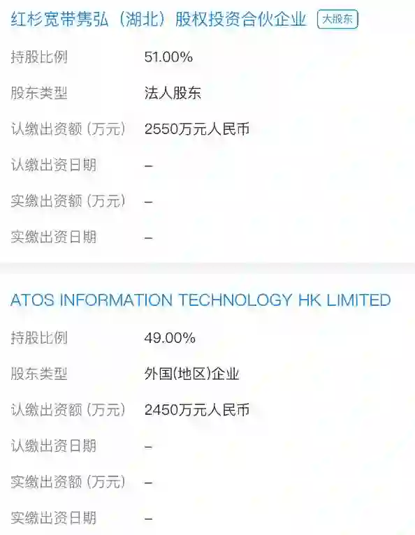 云头条通过企查查获悉:红杉宽带为大股东,股份占比 51 %,Atos 占比 49%。