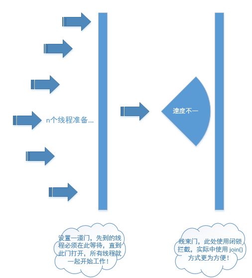 此处设置了一道门,以保证所有线程可以同时生效。但是,此处的同时启动,也只是语言层面的东西,也并非绝对的同时并发。具体的调用还要依赖于CPU个数,线程数及操作系统的线程调度功能等,不过咱们也无需纠结于这些了,重点在于理解原理!