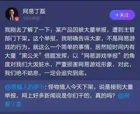游戏运营经理王磊磊上午一直在关注一条新闻。由于收到大量举报,才刚刚在鹅厂旗下WeGame平台上线的视频游戏《怪物猎人:世界》就被下架。有人就把矛头指向了猪厂,认为猪厂是“卑鄙的告密者”。还有人直接向丁三石求证。