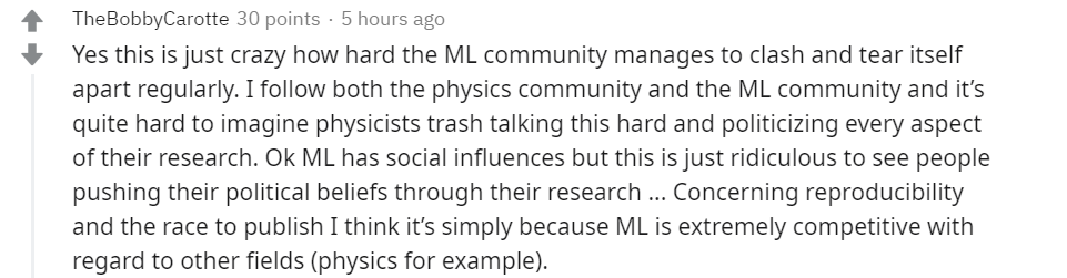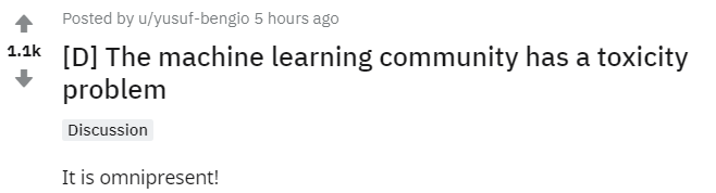 参考链接:https://www.reddit.com/r/MachineLearning/comments/hiv3vf/d_the_machine_learning_community_has_a_toxicity/