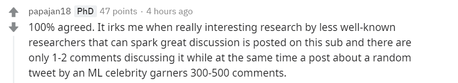 网友表示,一些不知名学者的有趣研究虽能引起注意,但评论的人却少之又少;与之相比,机器学习名人的一篇推特却能有数百条评论。这种现象恐怕不利于新研究或技术的推广和持续发展。