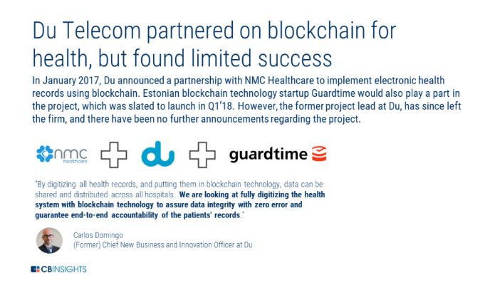 2017年1月,Du Telecom与NMC Healthcare 合作,探索基于区块链的医疗记录。然而,Du Telecom的前项目负责人已经离开了公司,后来也没有关于该项目的进一步声明。该项目本计划于2018年初启动。