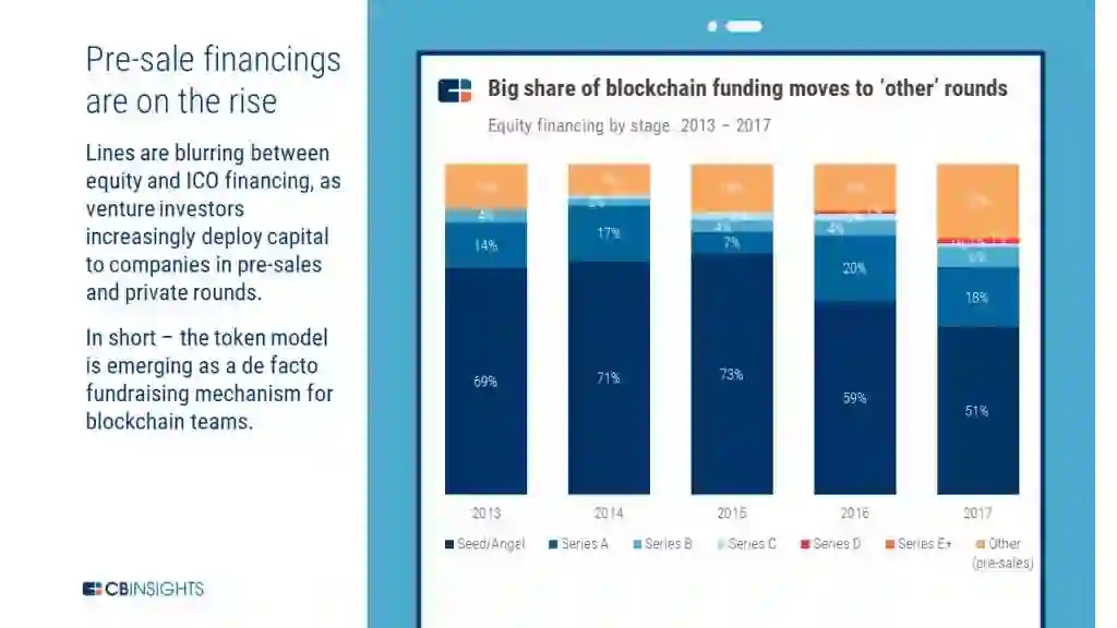 股权融资与 ICO 之间的界限日益模糊。传统的股权投资者,正在投资那些计划在自己的商业模式中使用代币的公司。 它们正通过预售、 SAFT 合约(如下所述)和符合监管规定的发行方式直接获取代币,这在几个月前似乎是不可能的。