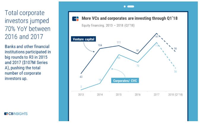 2017年,有119家公司和公司的风投部门投资了区块链技术,这是迄今为止最多的一年。此外,2018年第一季度的数量接近这一数字的一半,这意味着2018年将是该行业公司交易的一个重要年份。