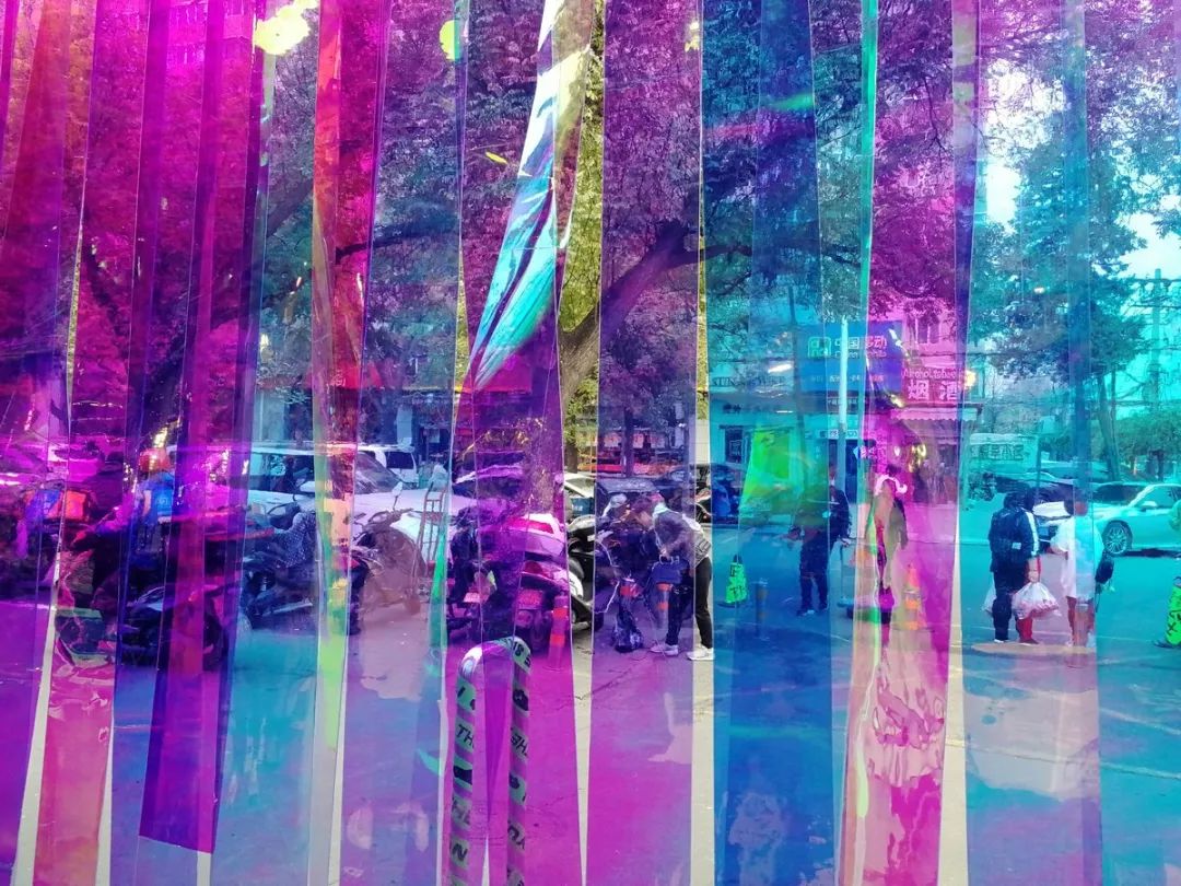 门口的霓虹色塑料门帘干净透亮,酷似前几年流行的镭射包。