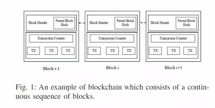 区块链,顾名思义,就是由一串连续的区块组成,每个区块用来存储交易,每个区块的头部会存上一个块的哈希值,从而确定唯一一个父区块,如图 1 所示。区块的头部包含着很多的信息,比如区块版本号,时间戳,所有交易的哈希值等等。
