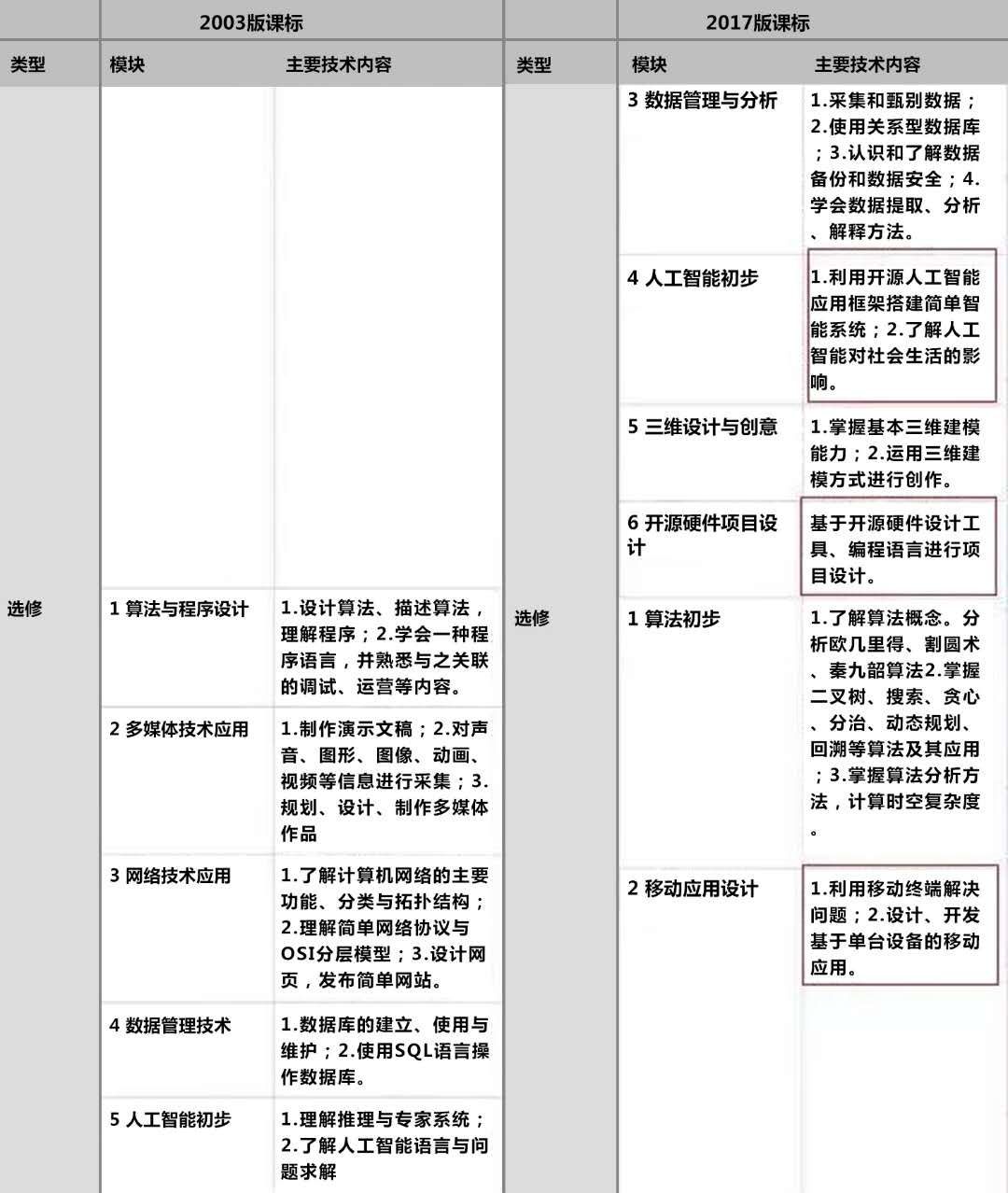 相比于 2003 版课标,此次公布的“新课标”中,在技术(信息技术和通用技术)上给予了学生更大的发展选择空间。可以看出,“新课标”大幅度减少了对于基本软件使用的要求,而大幅度提升了在编程、计算思维、算法方面的思维要求,以及人工智能、开源硬件、网络空间安全等知识面要求。