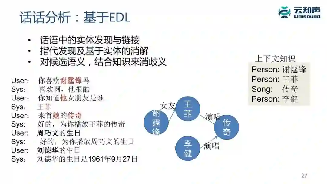 另外,我们做语义理解还有一种情况是结合知识做消歧义。比如用户说「周巧文的生日」,因为《生日》是一首歌的名字,周巧文是这个歌的歌手,这时候我们理解它是个音乐,因为本来就在音箱下面,这时我们可以直接播放周巧文的《生日》这首歌。但是如果系统又问一下「刘德华的生日」,这时候虽然我们的命名实体识别很有可能把「生日」也可能打成歌名的标签,刘德华打成歌手的标签,歌手的歌名,很容易以为是播放音乐,但是我们通过知识的验证知道刘德华并没有唱过这首歌,这时候要转成问答,这不是一个操控性的指令。直接返回他的生日,说「刘德华的生日是 1961 年 9 月 27 日」。