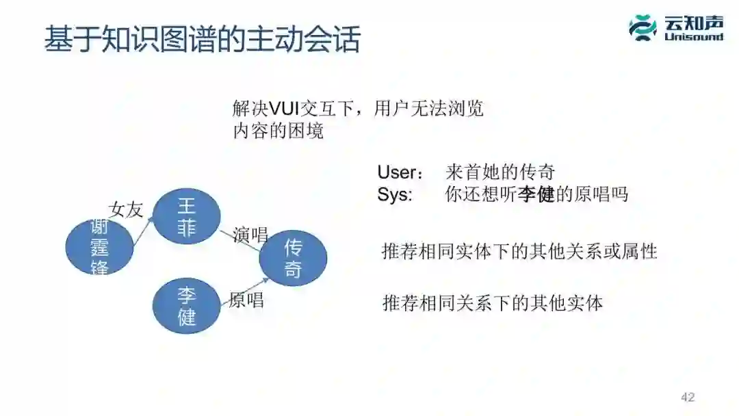 再举个例子,如果一个用户说「来首《传奇》」,机器可以主动问他说「播放以后还想听听李健原唱吗?」其实它的思想很简单,就是根据我们的知识图谱里面,看看相同实体下面有没有其他关系或者属性,或者推荐一个相同关系下面其他的实体。