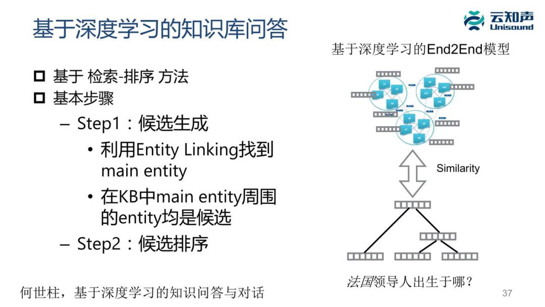 还有很多其他方法,目前比较多的是基于网络的方法,基于带注意力机制的循环神经网络的方法。这块我给一个参考,大家可以看一下《揭开知识库问答 KB-QA 的面纱》这篇文章,讲得非常详尽、非常好。我个人的观点是现在基于深度学习的知识库问答目前在工业界这块不是很成熟,它的效果不太可控,我们在系统里还是用基于传统的 Semantic Parsing 问答。