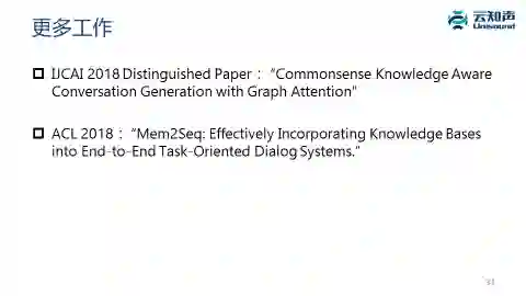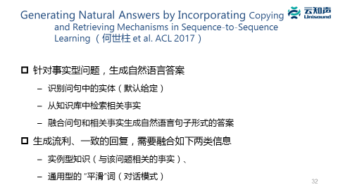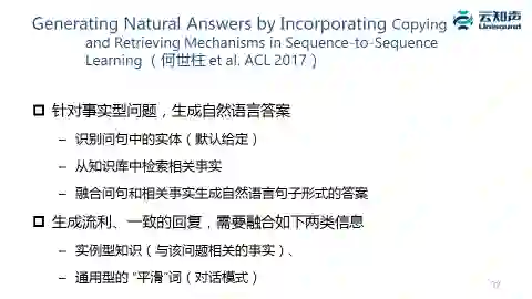 另外,做问答的时候,像我们这个例子问「姚明有多高」,我们生成比较自然的问答,说「他是两米二六,他是唯一一个可以从太空看到的人类。」当然,这是开玩笑的。这种聊天就融合了知识,它知道姚明的身高。这时候通过深度学习模型做 decode 时,除了生成常规的应答之外,有部分的应答还要从知识库里去检索,然后再把这个应答跟文本的应答拼在一起。