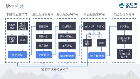 我们现在做应用很多情况都是做敏捷开发,也就是说可能半个月或者一个月就会发一次版本,这时候我们知识图谱也要跟着应用快速迭代,这时候是需要对知识图谱敏捷构建的过程。这里强调我们要对知识图谱做自动化的测试,测试完之后要判断它是否能够发版,发版之后要继续分析它目前的问题。可以把知识图谱看成一个软件,它是不是有哪些 bug 或者需要哪些新功能,根据这些制定下一个版本的发版计划。核心想法就是把知识图谱也看成是一个软件,也要有版本管理,也要有敏捷的开发。