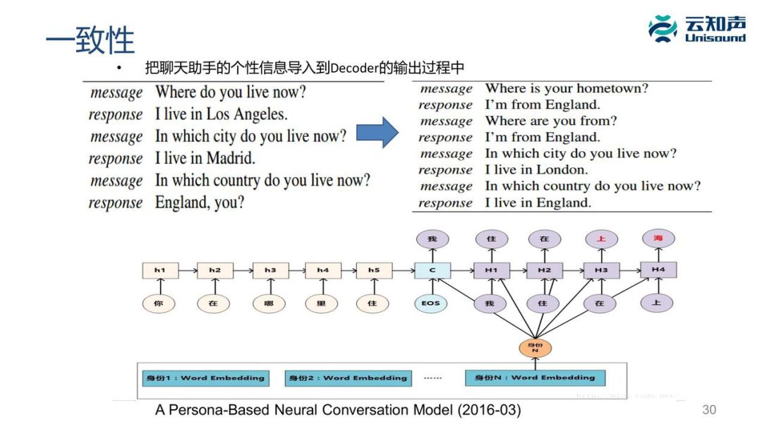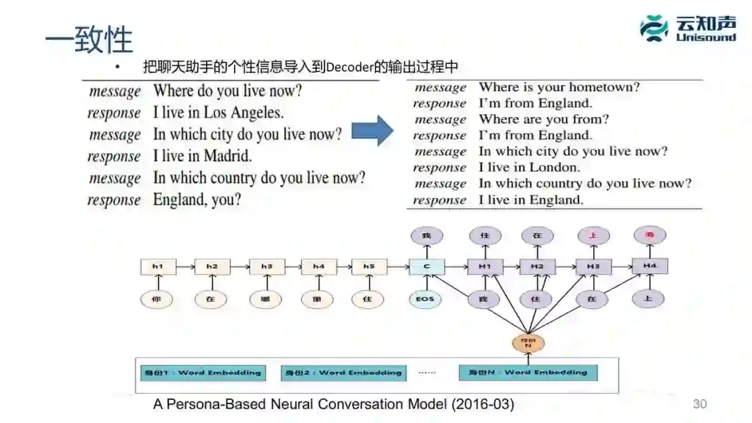 在深度学习里如果想把这些所谓的机器人的信息,进行建模或向量化处理导入到 decoder 模型里去,这时候它会优先从身份信息的词向量去生成应答,这样也能达到一定一致性的效果。