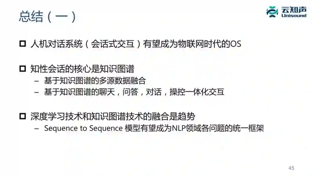 前面把聊天、问答、对话、语义解析怎么跟知识结合起来做了简单的介绍。接下来做个总结: