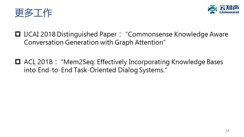 在线处理。基于知识做话语理解,怎么在聊天里把知识融合进去,还有基于知识图谱的问答,基于知识图谱的主动对话等。